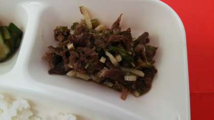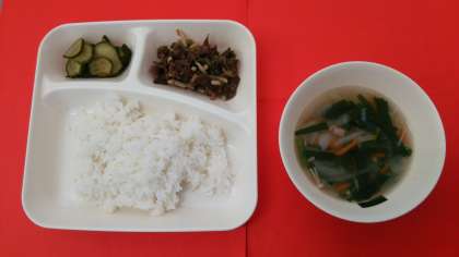 今日の献立は、「チンジャオニューロウスー」「ワンタンの皮のスープ」「きゅうりの辛みづけ」「ごはん」「牛乳」です。