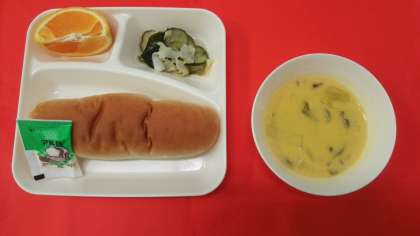 今日の献立は、「かぼちゃのクリームシチュー」「ミックス海そうのサラダ」「オレンジ」「コッペパン」「牛乳」です。