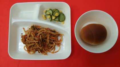 今日の献立は、「スパゲッティミートソース」「きゅうりとコーンのピクルス」「黒糖クレセントロールパン」「牛乳」です。