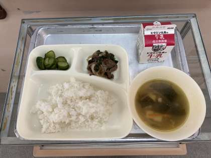 プルコギ・とうふとわかめのスープ・きゅうりの甘酢づけ・ご飯・牛乳