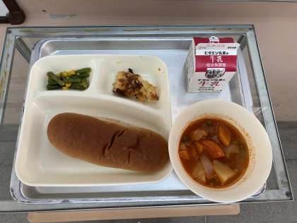 ケチャップ煮・さんどまめとコーンのソテー・りんごのクラフティ・黒糖パン・牛乳です。