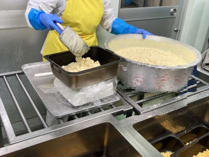 今日の給食では、コーンフレークを敷き詰めた上に、卵、クリーム、砂糖、小麦粉、りんごの缶づめを混ぜたものを流しいれ、蒸し焼きにしたクラフティです。