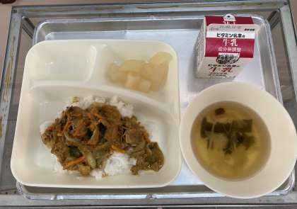 和風カレー丼・すまし汁・和なし(カット缶)・牛乳です。