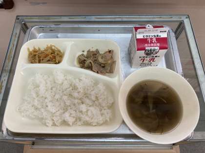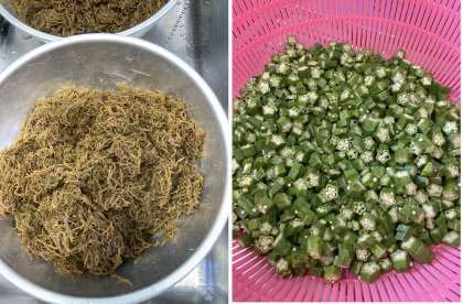 今日の給食では、オクラ、その他の材料と合わせて汁物にしています。