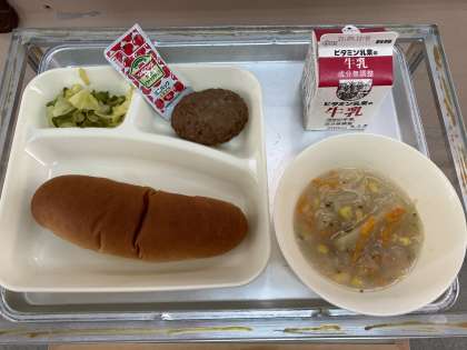 焼きハンバーグ・豆乳スープ・キャベツとピーマンのカレーソテー・