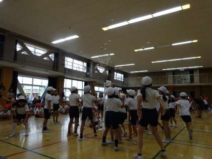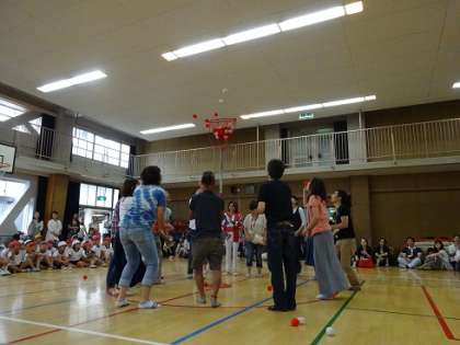 トーナメントで行い、接戦に盛り上がりました。全部の玉をどちらが早く入れるかを競います。最後に入れるアジャタボール(リボンがついている玉)が入った時には歓声が沸き起こりました。優勝は2組白チーム 準優勝は1組赤チーム 3位は3年生の保護者チームでした。保護者の皆様のたくさんの参観・ゲームへの参加ありがとうございました。