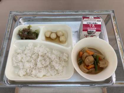今日は月見にちなんで、里芋を使った「一口がんものみそ煮」、だんごを使った「みたらしだんご」が出ました。