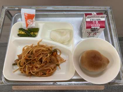 イタリアンスパゲッティ・グリーンアスパラガスのサラダ【ノンエッグドレッシング】・なし(豊水)・黒糖ロールパン・牛乳です。