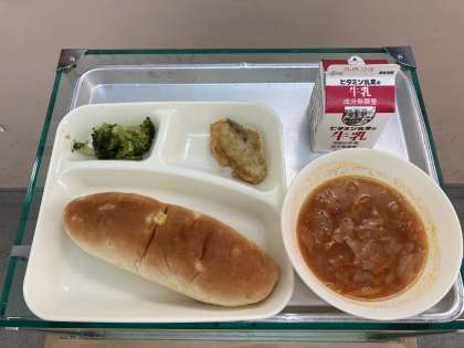 白身魚フリッター・ミネストローネ・ブロッコリーのサラダ・おさつパン・牛乳です。