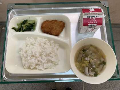 たらフライ・すまし汁・こまつなのごまあえ・ご飯・牛乳です。