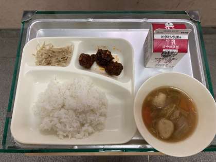 くじらのオーロラ煮・まる天と野菜のうま煮・もやしのピリ辛あえ・