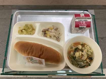 「中華おこわ」は、もち米に焼き豚、くり、しいたけ、調味液を加えて、蒸し焼きにします。チキンブイヨンとごま油でコクとう旨みを出した児童に人気の献立です。これにスープと野菜の炒め物の組み合わせです。