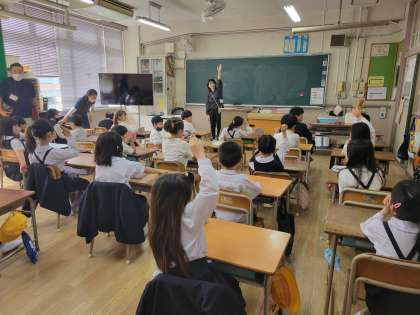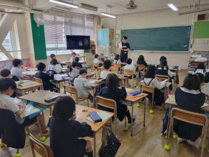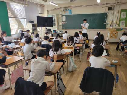 自己紹介のカードを記入したり発表の練習をしたりしています。みんな真剣な顔で取り組んでいます。