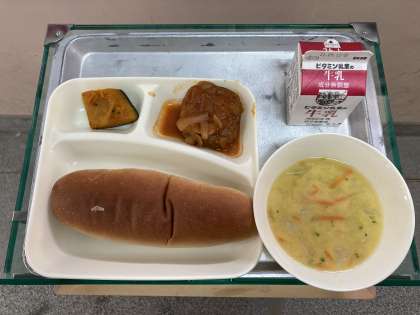 煮こみハンバーグ・コーンとキャベツのスープ・焼きかぼちゃ・