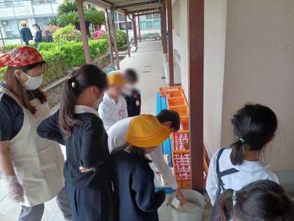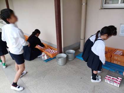 低学年に、給食の返却の仕方を教えたりお手伝いをしたりしています。