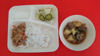 今日の献立は、「豚肉とこんにゃくの煮もの」「キャベツときゅうりのゆずの香あえ」「ツナ大豆そぼろ」「ごはん」「牛乳」です。
