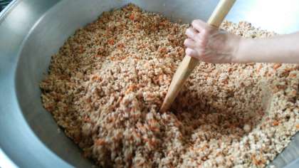 「ツナ大豆そぼろ」は、平成26年度献立調理検討会議で開発された献立です。初めて給食に登場します。ツナとひきわり大豆、にんじん、しょうがをいためます。(写真2枚目)ごはんによく合う一品です。(写真3枚目)