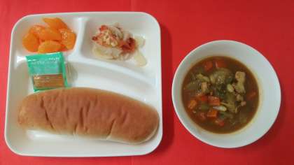 今日の献立は、「鶏肉とてぼ豆のカレー煮(米粉)」「じゃがいもとトマトの重ね焼き」「みかん(缶詰)」「大型コッペパン・りんごジャム」「牛乳」です。