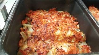 「じゃがいもとトマトの重ね焼き」は、生のトマトを使用しています。1クラス分ずつミニバットに入れて焼き物機で焼きます。(写真2枚目)毎回好評な献立です。
