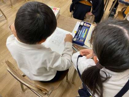 辞典には、言葉を早く調べるためのしくみがたくさんあります。子どもたちは、自分が見つけたしくみを、隣同士で確認したり、全体に発表したりしました。