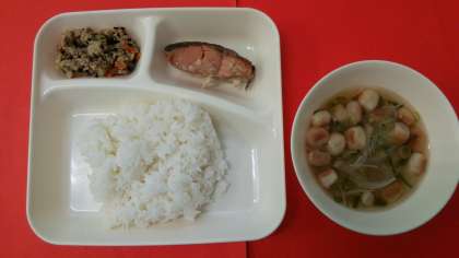 今日の献立は、「さけのてり焼き」「五目汁」「高野どうふのいり煮」「ごはん」「牛乳」です。