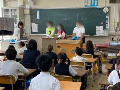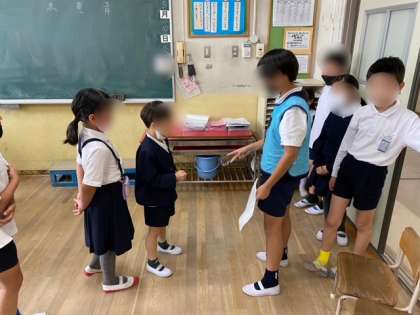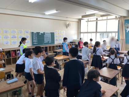 1年生から6年生までの縦割り班で集まりました。メンバーの自己紹介や並び方を決めた後、じゃんけんゲームで楽しみました。