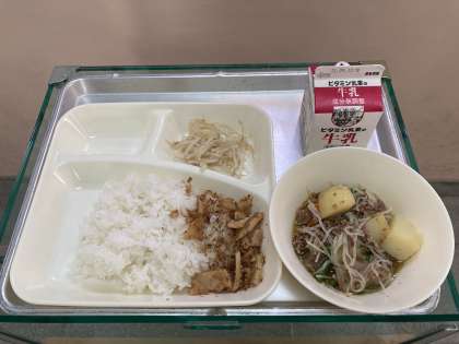 肉じゃが・もやしのゆずの香あえ・ごまかかいため・ご飯・牛乳です。