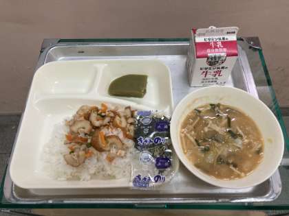 かやくご飯・みそ汁・まっ茶ういろう・牛乳です。