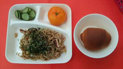 今日の献立は、「焼きそば」「あっさりきゅうり」「冷凍みかん」「黒糖クレセントパン」「牛乳」です。
