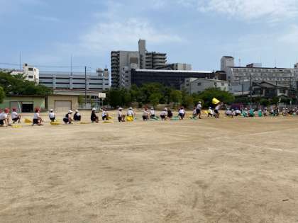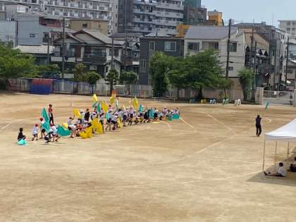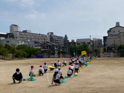 運動会の団体演技のフラッグの練習です。ウェーブでは、数を数えながら端まで波をつなげます。