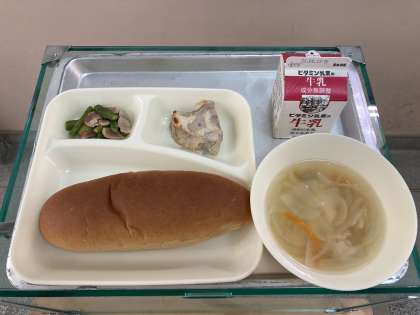 かつおのマリネ焼き[ノンエッグドレッシング]・スープ・グリーンアスパラガスのソテー・黒糖パン・牛乳です。