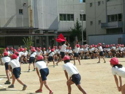 入場行進、開・閉会式、はじめの体操、終わりの体操(弁天バージョン)、応援合戦など盛りだくさんな学習内容でした。途中、トイレ休憩と給水タイムをとりましたが、1年生から6年生まで長時間集中して取り組むことができました。