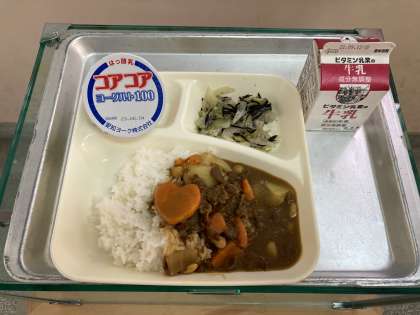 今日の給食では、「牛肉と大豆のカレーライス」として登場しました。