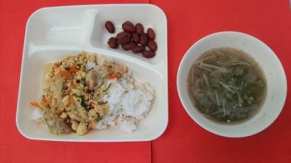 今日の献立は、「親子丼」「すまし汁」「金時豆の煮もの」「牛乳」です。