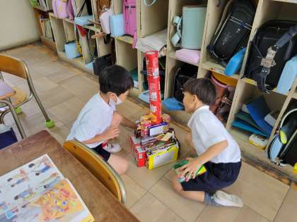 いろいろなかたちの箱を友達と一緒に並べたり高く積んだりしました。