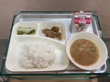 鶏肉のしょうゆバター焼き・みそ汁・野菜いため・ご飯・牛乳です。