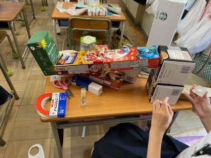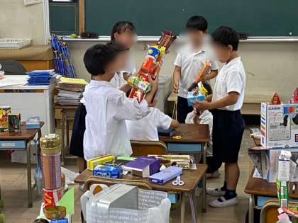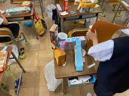 1年生の図画工作では、箱を使っていろいろなものを作りました。つなげたり、重ねたり、足や手をつけたりと、思い思いの形にして表現しました。