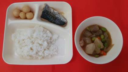 今日は、月見の行事献立です。「さごしのしょうゆだれかけ」「さといもとこんにゃくの煮もの」「みたらしだんご」「ごはん」「牛乳」です。