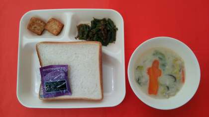 今日の献立は、「はくさいのクリーム煮」「あつあげのしょうがじょうゆかけ」「牛肉と三度豆のごまいため」「食パン・ブルーベリージャム」「牛乳」です。