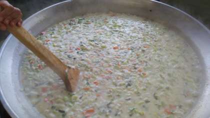 「はくさいのクリーム煮」は、鶏肉とはくさいとチンゲンサイなどの野菜と、10月から使用できる生しいたけを使用し、牛乳とクリームで煮て、でんぷんでとろみをつけた中華風のクリーム煮です。(写真2枚目)