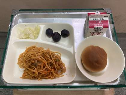 ぶどう(巨峰)・黒糖ロールパン・牛乳です。