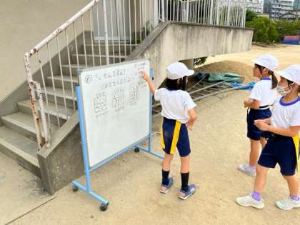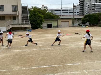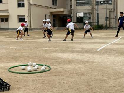 2年生は、体育で「たから運び鬼」をしています。鬼にタグを取られないようにすり抜けてボールを運びます。