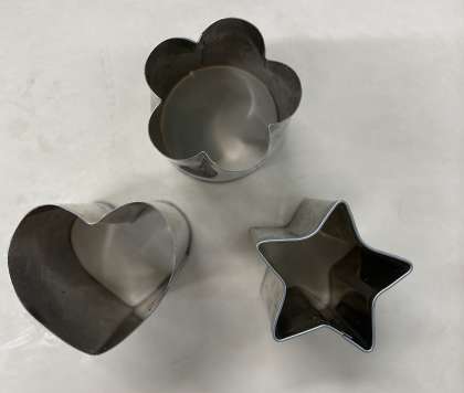 を使用しています。この献立にはラッキー人参が入っていて、今回は「星・花・ハート」の形でした。給食室で、型を使って人参をくり抜いています。今日の献立は、これにサラダと果物缶の組み合わせでした。