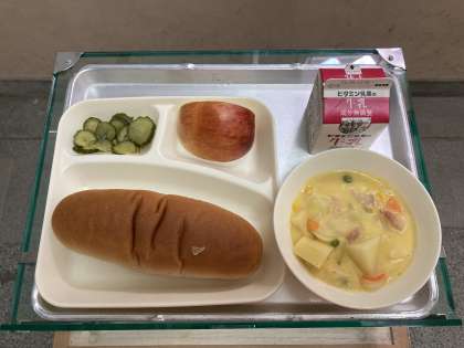 「豆乳コーンクリームシチュー【米粉】」は、小麦アレルギーのある児童も食べることができるように、小麦粉を使った手作りルウの代わりに、水どきの上新粉でとろみをつけています。また、牛乳アレルギーのある児童が食べることができるように、豆乳を使用しています。