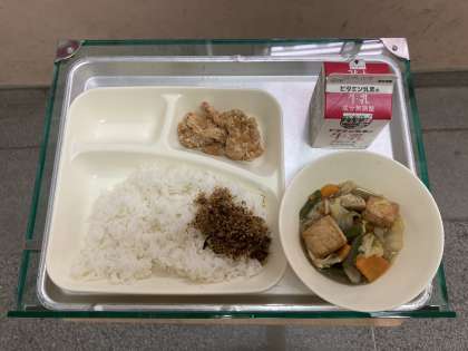 鶏肉のたつたあげ・あつあげと野菜の煮もの・おかかなっ葉・ご飯・