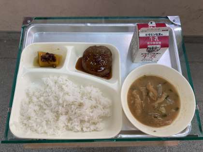 和風ハンバーグ・みそ汁・かぼちゃのいとこ煮・ご飯・牛乳です。