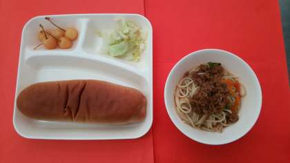 今日の献立は、「タンタンめん」「キャベツの甘酢づけ」「さくらんぼ(缶詰)」「黒糖パン」「牛乳」です。