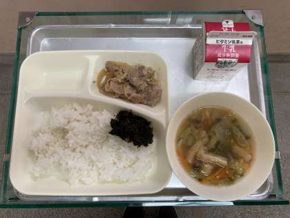 豚肉のスタミナ焼き・すまし汁・のりのつくだ煮・ご飯・牛乳です。