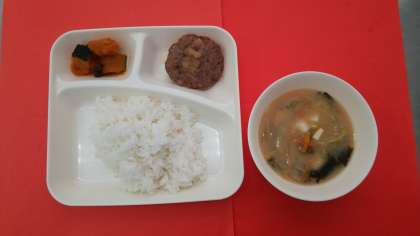 今日の献立は、「和風おろしハンバーグ」「みそ汁」「かぼちゃのいとこ煮」「ごはん」「牛乳」です。