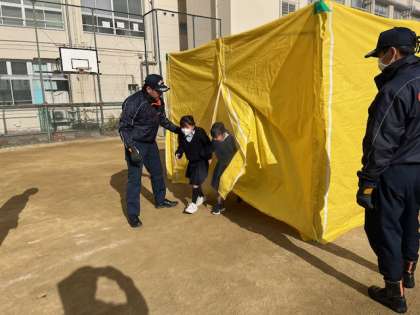 今日は、消防署の隊員の方々や港区役所の防災担当の方に来ていただき、防災学習を行いました。災害時の避難の仕方や自分の命を守る行動について学びました。